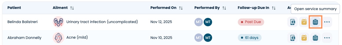 When you land on the Service Summary, you can see all important details about your assessment at a glance. The top section shows patient identifiers, assessment details with billing PIN (if applicable), follow-up schedule and the notified care provider. The sidebar displays prescribed and recommended therapies for quick reference.